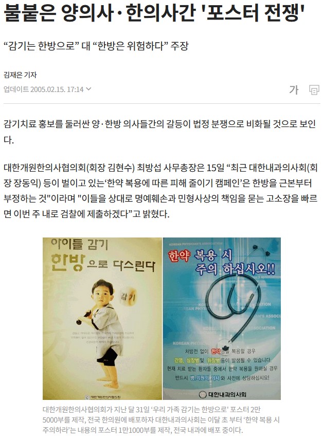 개원한의사협회라는 단체에서 "감기는 한방에서"치료하자고 포스터를 대대적으로 붙이고 홍보하기 시작한 것이고 이에 연간 2조원의 감기 매출을 올리던 내과의사는 격렬한 반격에 나서게 된다.