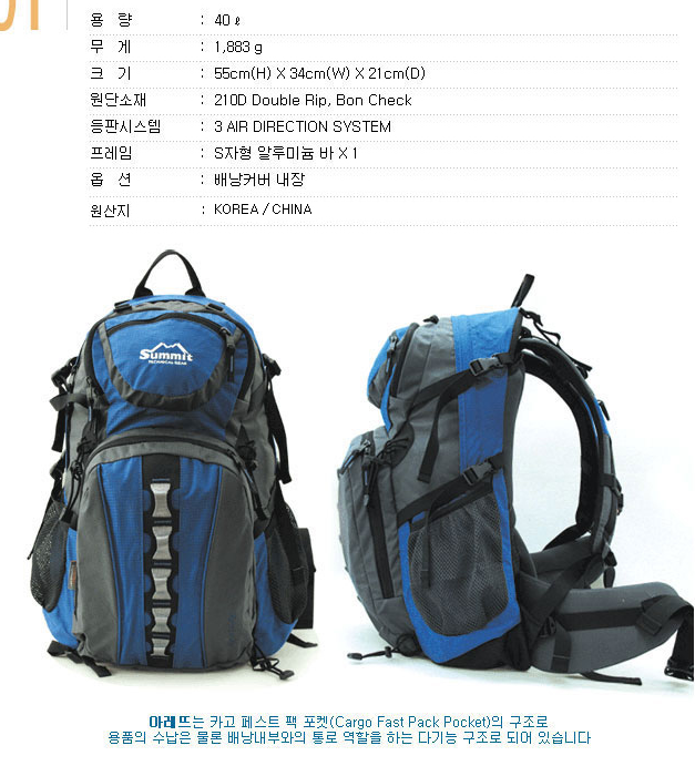 라운드형 역사상 전무후무한 최대용적 무려 40L짜리 배낭. 라운드형을 이렇게 대용량으로 만드는 회사는 지금까지 없었고 앞으로도 없을 것이다. 왜인줄 아나? 하중이 아래로 처져 너무너무 불편하기 때문.