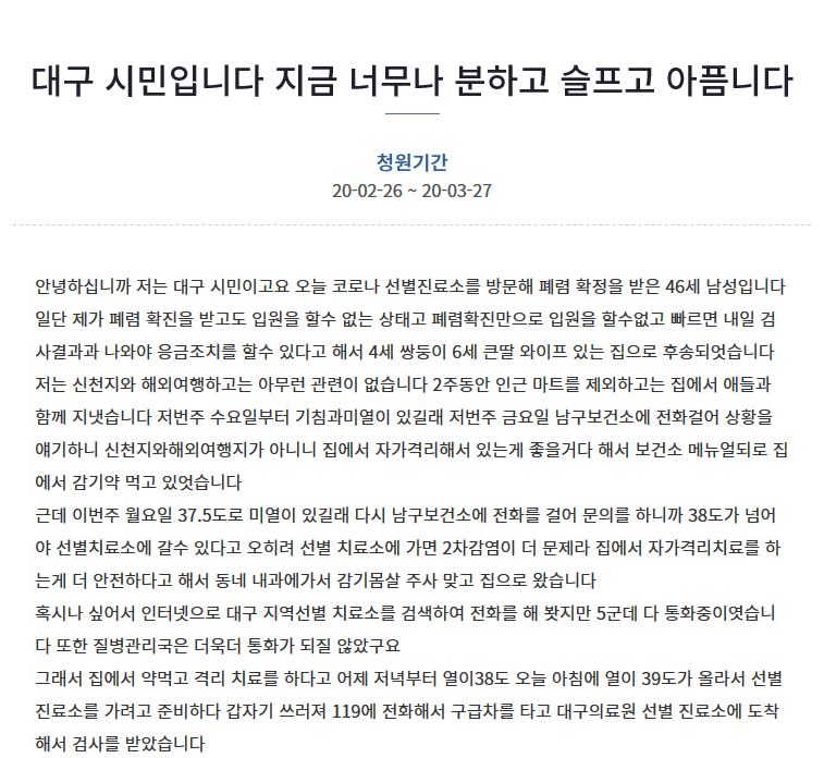 24일 저녁 기침, 몸살 (보건소 문의했음. 열 안 나면 코로나 아닌것 같다. 신천지 위주로 검사 중이라 검사 못 받는다라는 답변받음. 자가격리 지도받음.)
