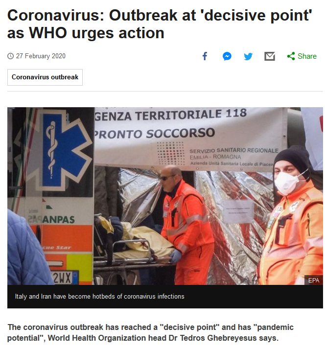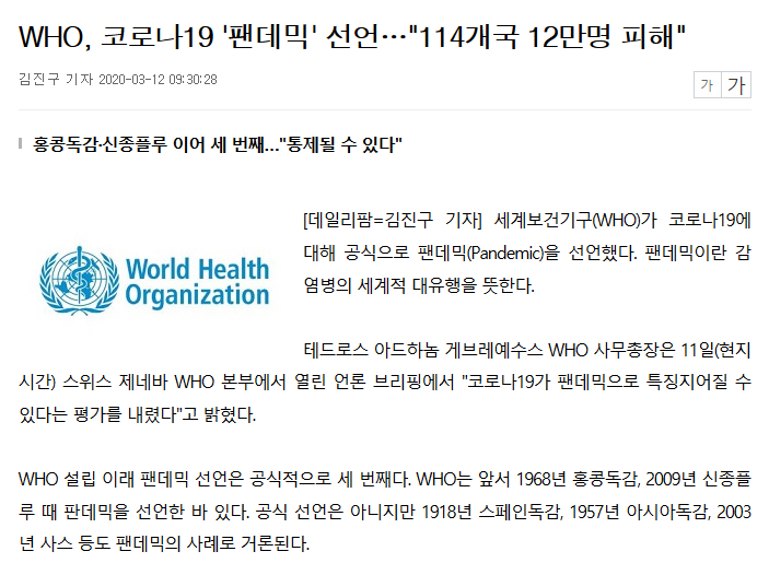 기사 내용은 이렇다. WHO 대빵 의사 테드로스 게브레이져스 박사는 "코로나 바이러스가 위급한 시점에 도달해있으며 전세계적인 유행될 조짐이 있다"고 발표, 각국에 대처할 것을 강력 권고하다.