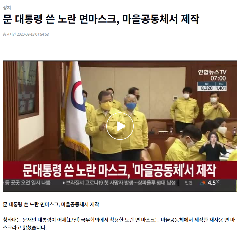 국내 마스크가 부족해지자 키친타올로 만든 마스크를 공급한다는 뉴스