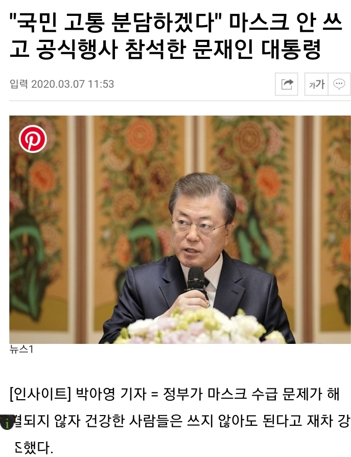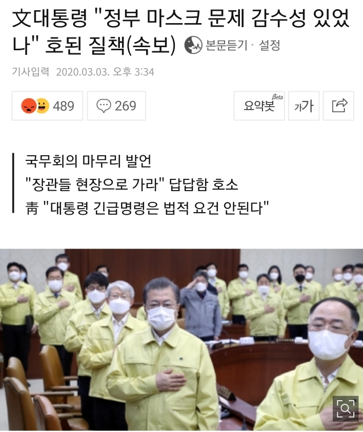 문재인 대통령은 이날 국무회의에서 "마스크 문제가 대단히 심각하다고 인식하라. 정부가 감수성 있게 느꼈는지 의심스럽다!!"라고 장관들을 질타하심.