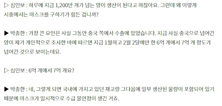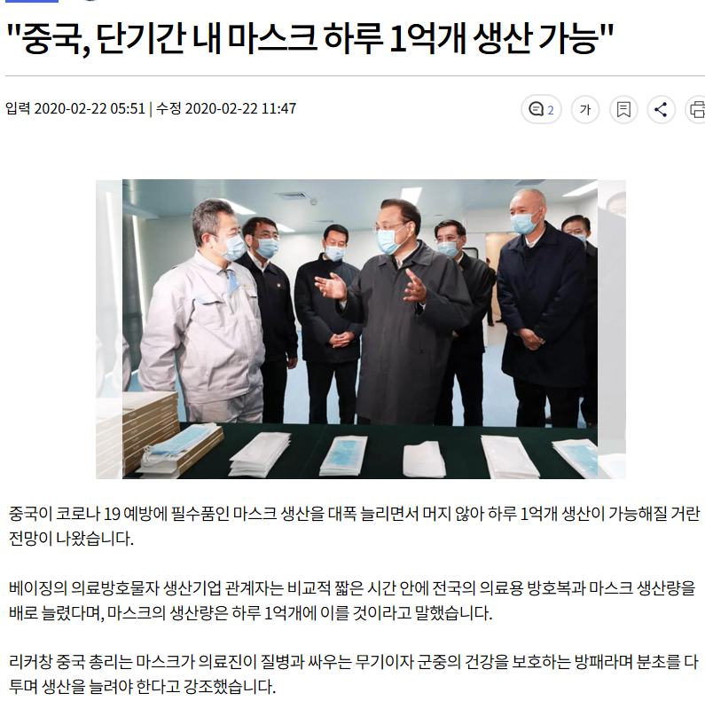웰킵스 마스크 공장 사장님 말씀 : 두달동안 중국에 7억개가 수출됐다!!!