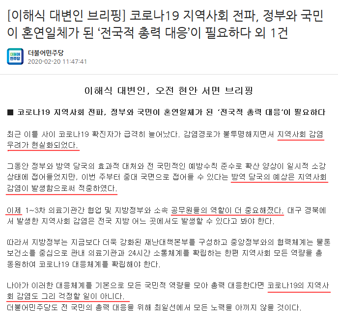 첫 사망자가 나온 다음날 민주당의 이해식(서강대 철학과 출신) 논평이다