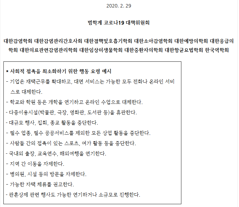 대한감염학회에서도 모든 중국 입국자들을 2주간 자가격리시키고 감시해야 한다고 대정부 권고안 발표함.