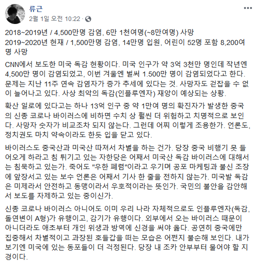 류근 (중앙대 문예창작과, 시인) "미국독감이 더 위험하다. 코로나와 비교조차 되지 않는다!"