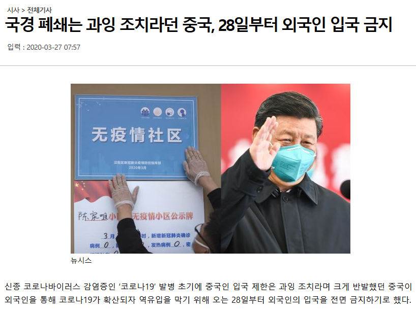 국경봉쇄. 중국발 입국자 격리가 바이러스 확산방지에 효과가 없다고 주장하면서