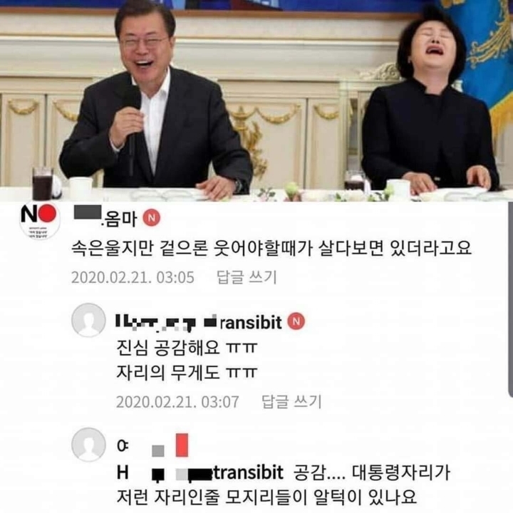 (사진 설명 = 코로나19 첫 사망자가 나와서 속으로 울면서, 겉으로는 애써 웃고 있는 대통령 내외)