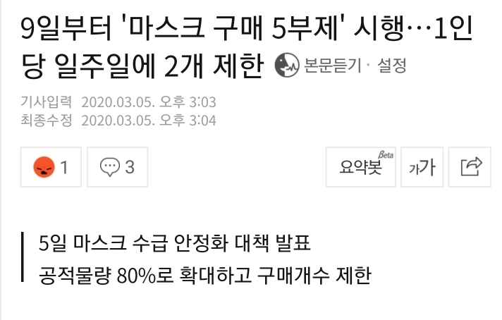 마스크로 민심이 들끓자 내놓은 대책이 마스크 가격 상한제!!!! 마스크 5부제.