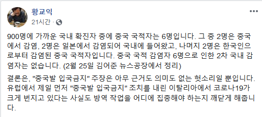 조국사태 이후 특급논객으로 떠오른 진중권(서울대 미학과)교수가 중국인이 감염원이고 친중정권이 눈치를 보다가 퍼졌다는 것은 미신이라고 주장. 중국인에 의한 감염은 없다!!!