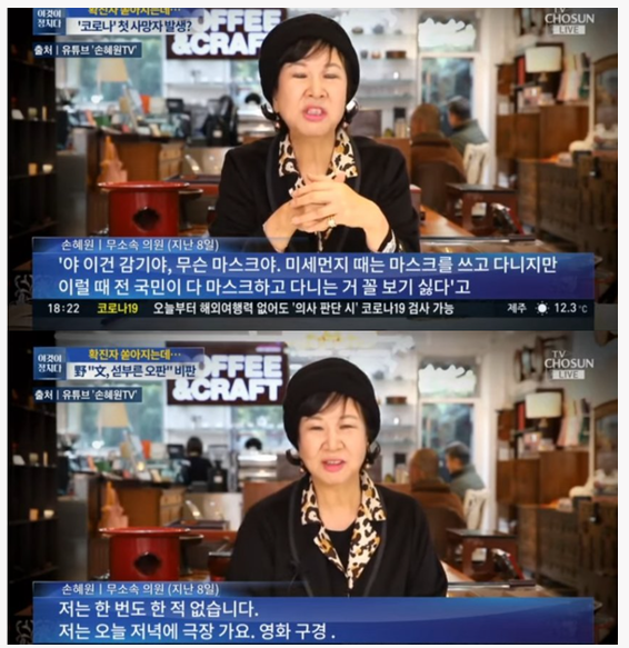 불과 2주전 아휴 마스크 쓰고 다니는 거 꼴뵈기 싫어! 나는 마스크 안 써.라고 했던 손혜원 의원님이 확진자 잘 찾아낸다고 칭찬함!!