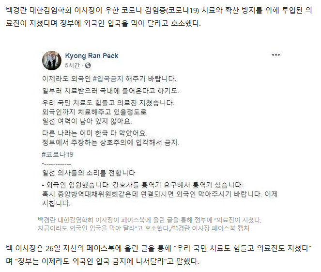 3월 26일 대한감염학회에서 또 외국인 입국을 막아달라고 함. 2월2일에도 말했지만 정부에서 묵살한 바 있음.