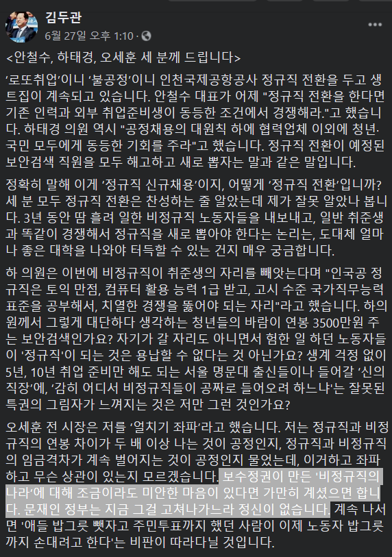 우리나라 비정규직은 김대중정부에서 최초로 탄생시켰고