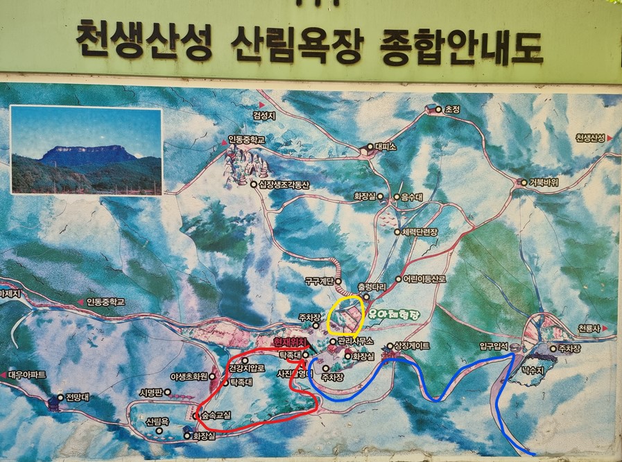 좌측으로 가면 능선길을 탈 수 있다. (지도의 빨강색) 약 1시간 정도 걸리는 (거리는 1km) 트레킹코스이다. 이 길 강추.