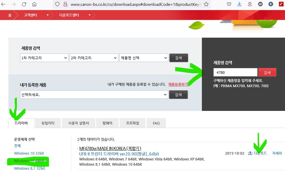 윈도우 10 64비트라고 나오면 캐논 코리아https://svc.kr.canon/solution/solutionList/에 가서
