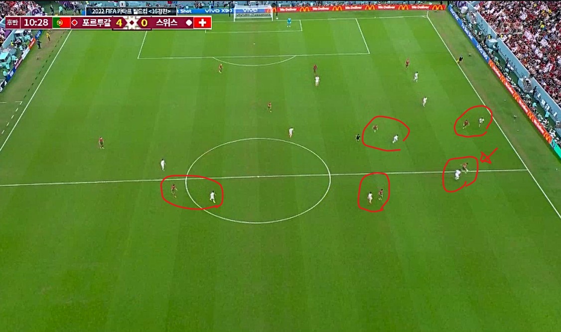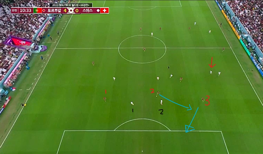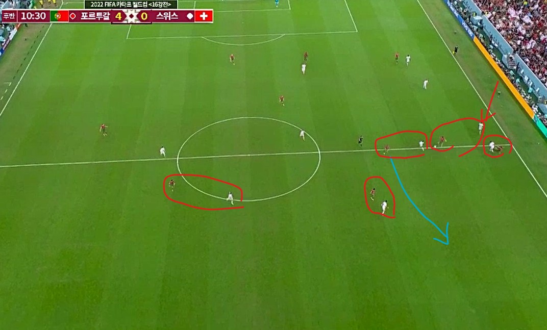 잠시후의 모습이다. 위 화면의 우측 빨간 화살표 수비수를 보라.