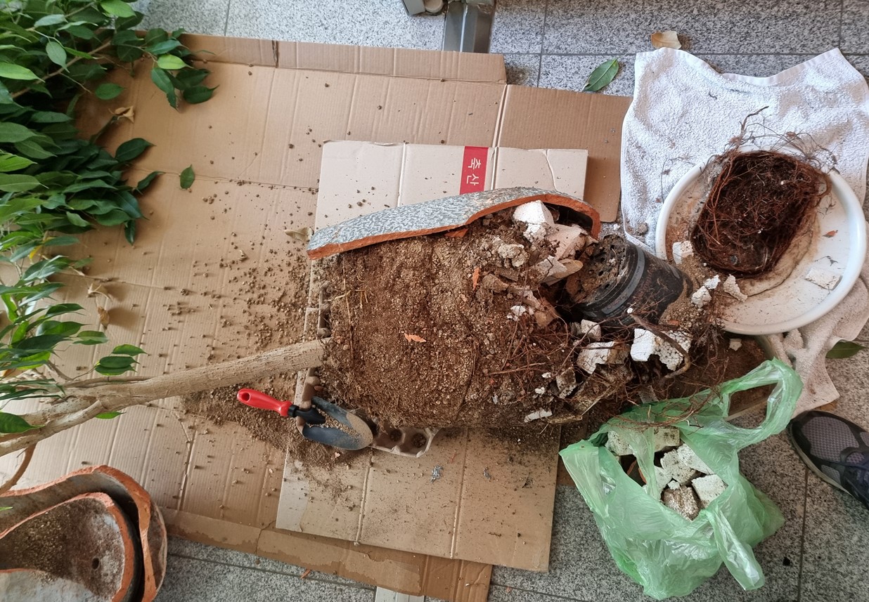 지난 9일, 김씨가 무려 11년만에 킹벤자민과 녹보수 분갈이를 했다. 가지치기를 안 했더니 11년을 키웠는데도 목대가 저렇게 가늘다. 킹벤자민 뿌리가 빠질지 걱정했으나 다행히도 화분 전체에 뿌리가 가득 차서 화분을 밀어대는 바람에 발로 살짝만 밟아도 우지끈 부서졌다.