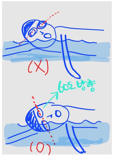 첫번째 그림은 잘못된 자세다. 눈의 위치가 입보다 높게 있다. 이러면 입이 호흡할 수 있는 시간이 짧아진다.