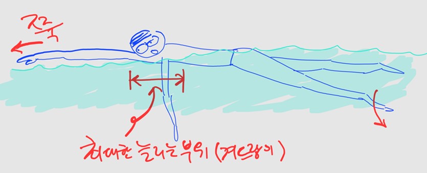 손이 멀리 닿도록 순간적으로 몸을 앞으로 튕겨낸다. 2비트킥의 핵심은 1cm이라고 멀리 손을 뻗어서 물속에 들어가게 하는 것이다.