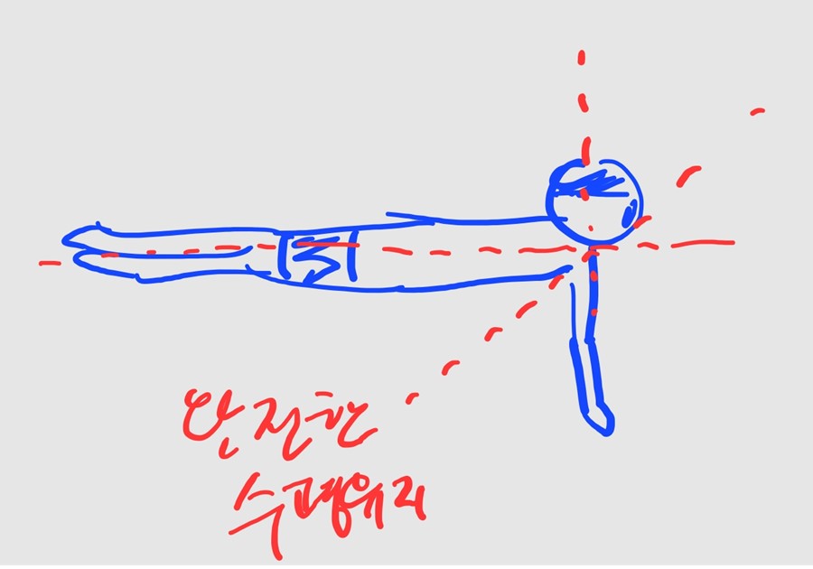 롤링하던 몸통은 수면에 수평을 만드는 순간이어야만 한다. 배꼽이 바닥을 봐야 한다.. 이게 가장 중요한 지점이다. 몸통이 덜 돌아도 안되고 더 돌아가도 안 된다. 정확하게 180도 엎드린 자세로 돌아있어야 한다. 물을 당기는 팔이 어깨 면과 수면에 수직으로 늘어뜨려져있는 그 순간 내 몸통은 완전히 수평인 순간을 지나야 한다.