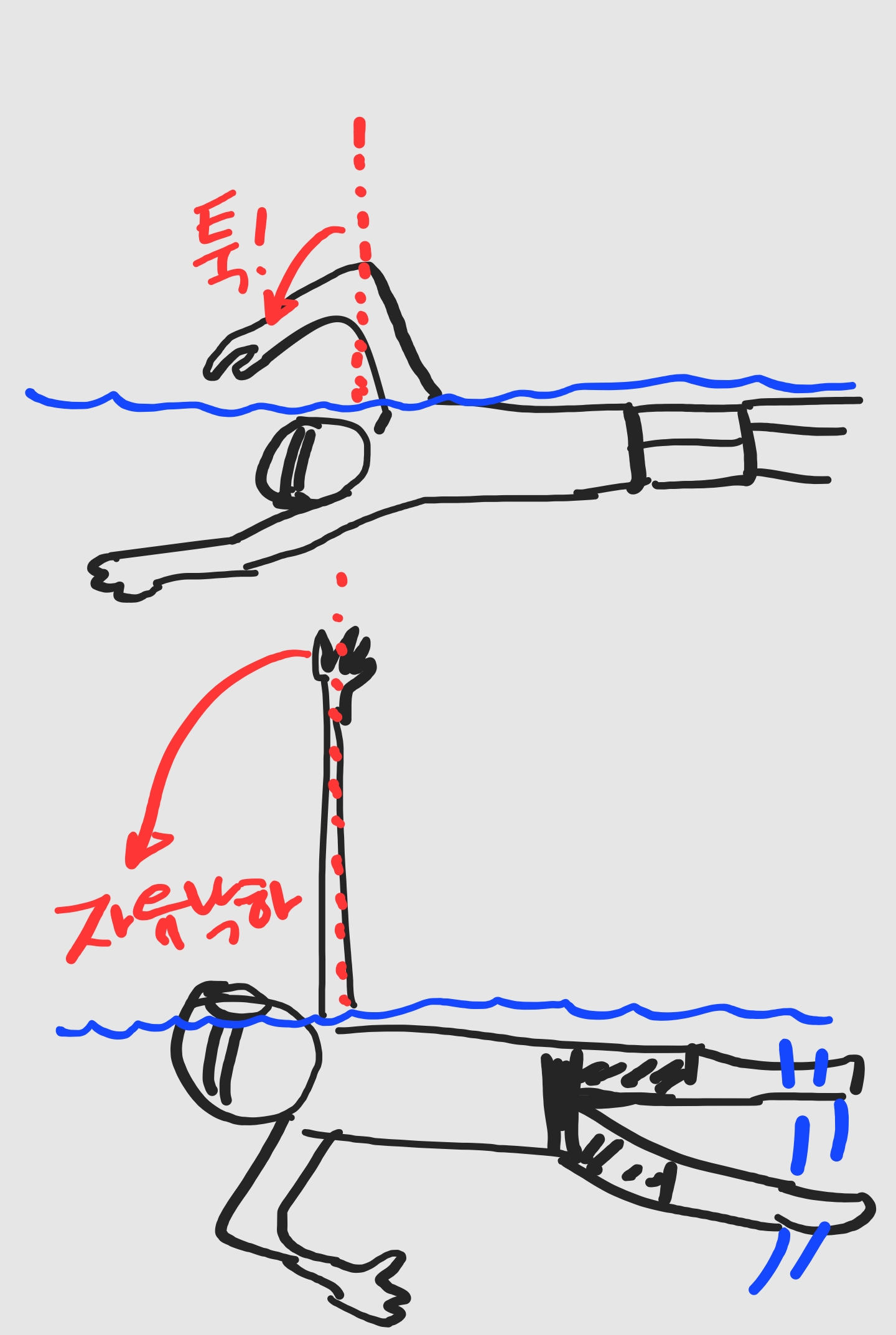 두번째 중요한 점 : 멀리 있는 물을 당기려고 애쓰지 않는다. 그러면 어깨 다 나간다. 내 몸 가까이 손을 당길때까지 그냥 시체처럼 당긴다. 그럼 언제 당기냐 아래 그림을 보라. 절대로 내 어깨 위쪽으로 팔이 뻗었을때 힘을 주지 않는다. 힘 주면 회전근개 다 나간다. 그냥 시체처럼 스르르륵 댕기다가 내 젖꼭지를 지나면 갑자기 화가난 것처럼 물을 확 뒤로 퍼낸다.