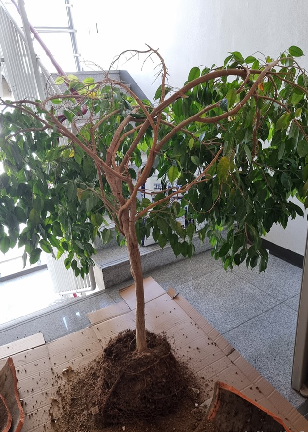 지난 9일, 김씨가 무려 11년만에 킹벤자민과 녹보수 분갈이를 했다. 가지치기를 안 했더니 11년을 키웠는데도 목대가 저렇게 가늘다. 킹벤자민 뿌리가 빠질지 걱정했으나 다행히도 화분 전체에 뿌리가 가득 차서 화분을 밀어대는 바람에 발로 살짝만 밟아도 우지끈 부서졌다.