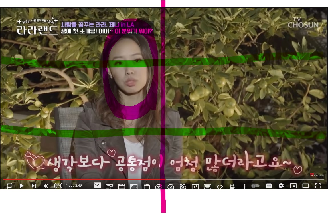 1. 화각이 좁을수록 시점을 더 높이고 정면에서 멀리 틀어서 찍는다. 위의 프레임은 전중 부근에서 피사체의 우측으로 15도 정도 틀어서 촬영했다, 아래 프레임은 시점이 피사체의 입술 부근에 있고 좌측으로 45도 정도 틀어서 촬영했다.