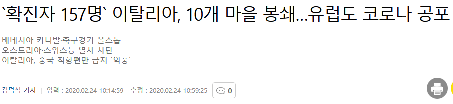 기사 내용은 이렇다. WHO 대빵 의사 테드로스 게브레이져스 박사는 "코로나 바이러스가 위급한 시점에 도달해있으며 전세계적인 유행될 조짐이 있다"고 발표, 각국에 대처할 것을 강력 권고하다.