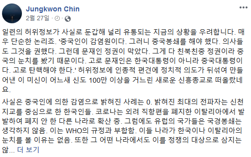 조국사태 이후 특급논객으로 떠오른 진중권(서울대 미학과)교수가 중국인이 감염원이고 친중정권이 눈치를 보다가 퍼졌다는 것은 미신이라고 주장. 중국인에 의한 감염은 없다!!!