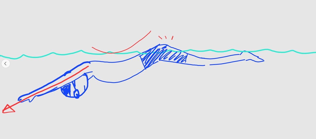 이렇게 팔을 수면 가까이 붙이는 습관을 들이면 스트로크를 할 때 팔근육보다 등근육으로 당기게 된다. 팔을 당기는 느낌이 아니라 가슴을 제끼고 등을 펴는 느낌으로 물을 당길 수 있다.