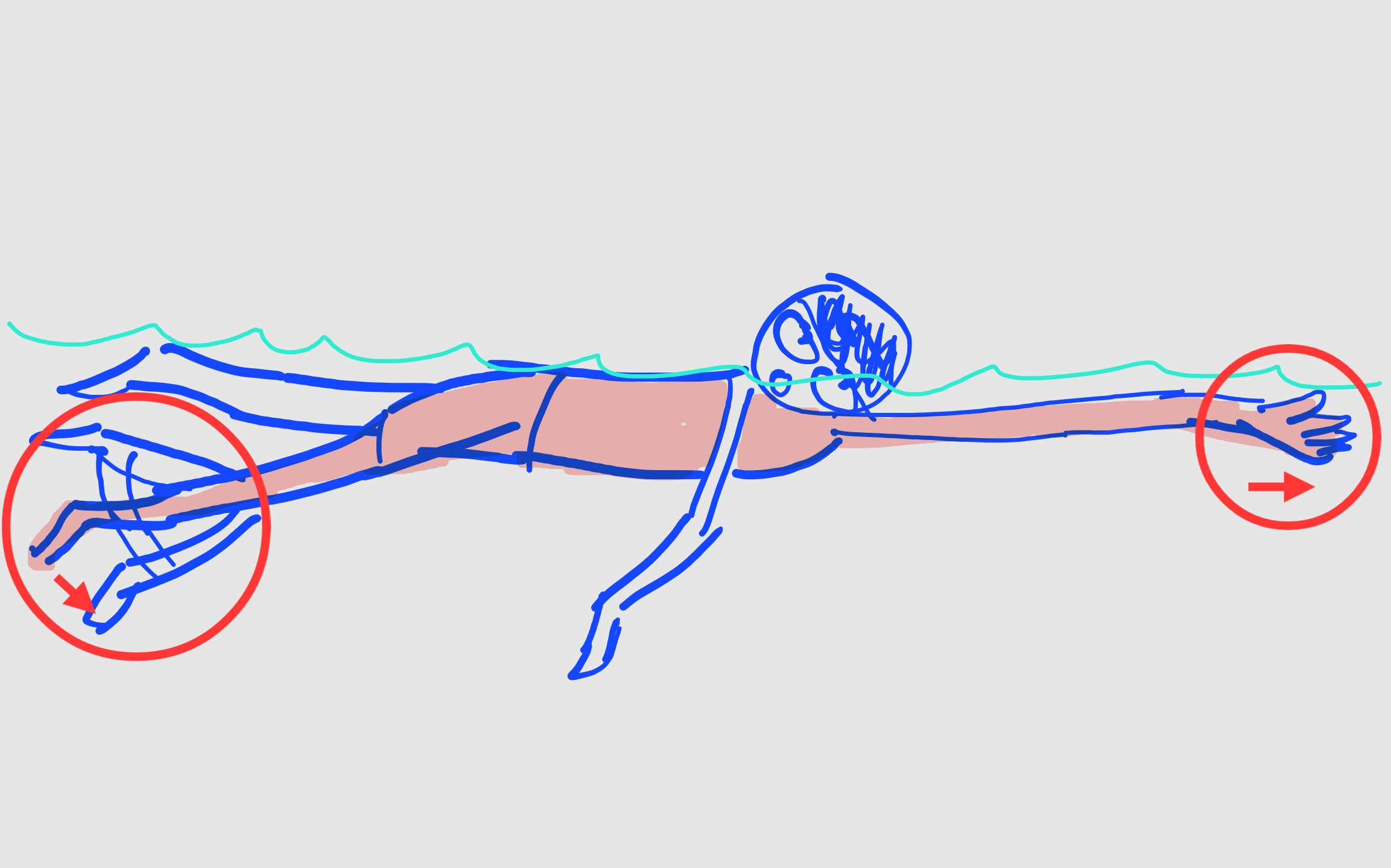 폐의 부력을 이겨내고 상체의 무게중심을 물속 앞으로 던져넣어라. 엎어져라. 엉덩이와 하체를 수면에 붙여서 저항을 줄어들게.
