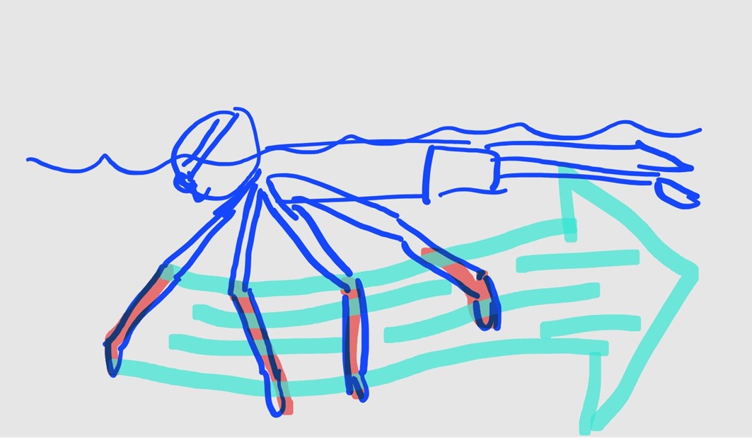 이렇게 천천히 밀어도 되나 싶을 정도로 천천히 밀어라. 한방울의 물도 모두 뒤로 밀어낸다는 마음으로 돌처럼 단단하게 고정시킨 전완부에 걸린 물을 뒤로 밀어낸다. 허벅지까지 끝까지 밀어낸다. 단, 수면 위로 물을 퍼올려서는 안된다.