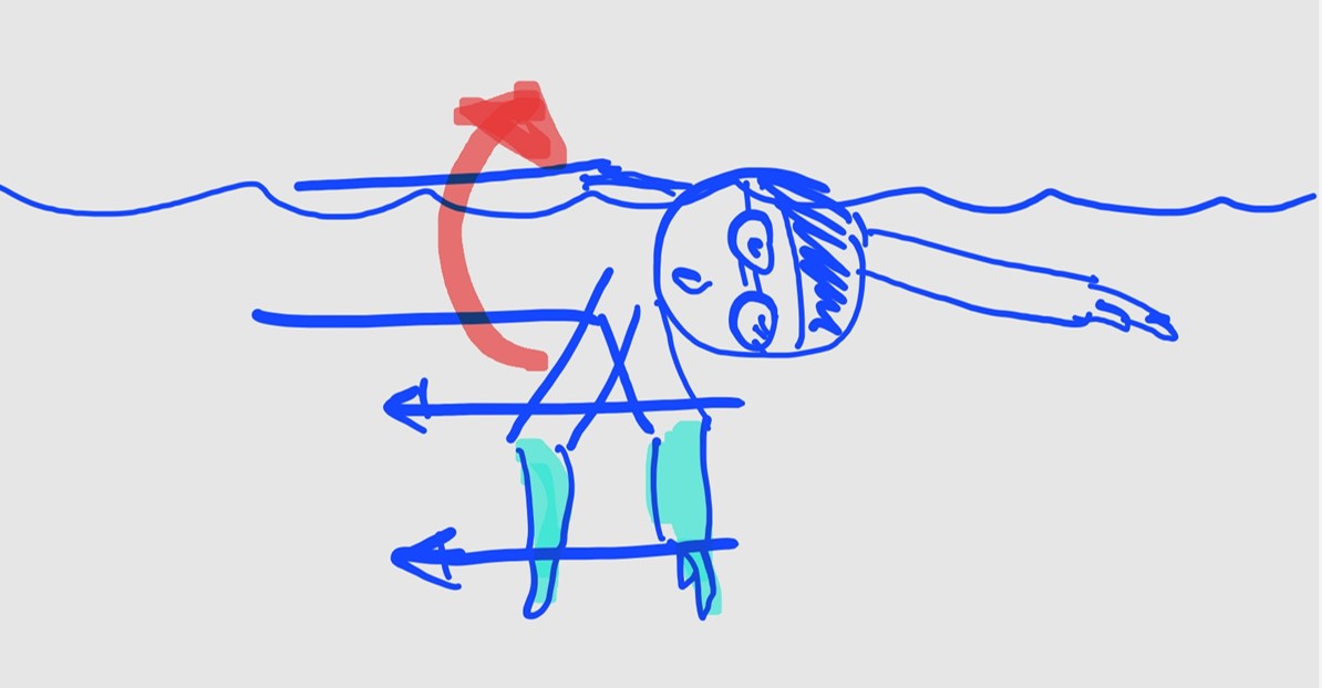 빨강색 어깨를 눌러주면 반대쪽 어깨가 물 위로 돌아서 올라간다. 드라이버 돌아가듯이