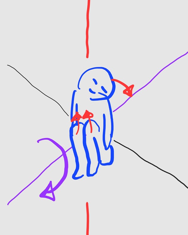 중심은 배꼽이다. 아래 보라색 화살표를 잘 봐라. 저렇게 옆으로 돌아야한다.