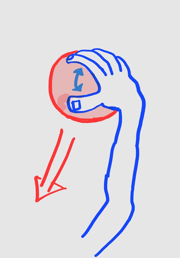 손목의 모양은 마치 쇠공을 잡고 있는 모양으로 엄지를 벌리고 나머지 4손가락은 살짝 구부린채 강하게 고정한다.