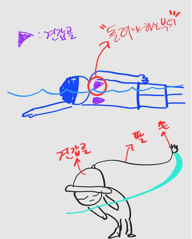 수영 마치고 집에 돌아오면 팔이나 어깨가 아파서는 안된다. 등과 승모근, 날개뼈 부위가 뻐근해야 제대로 수영하고 온 것이다.