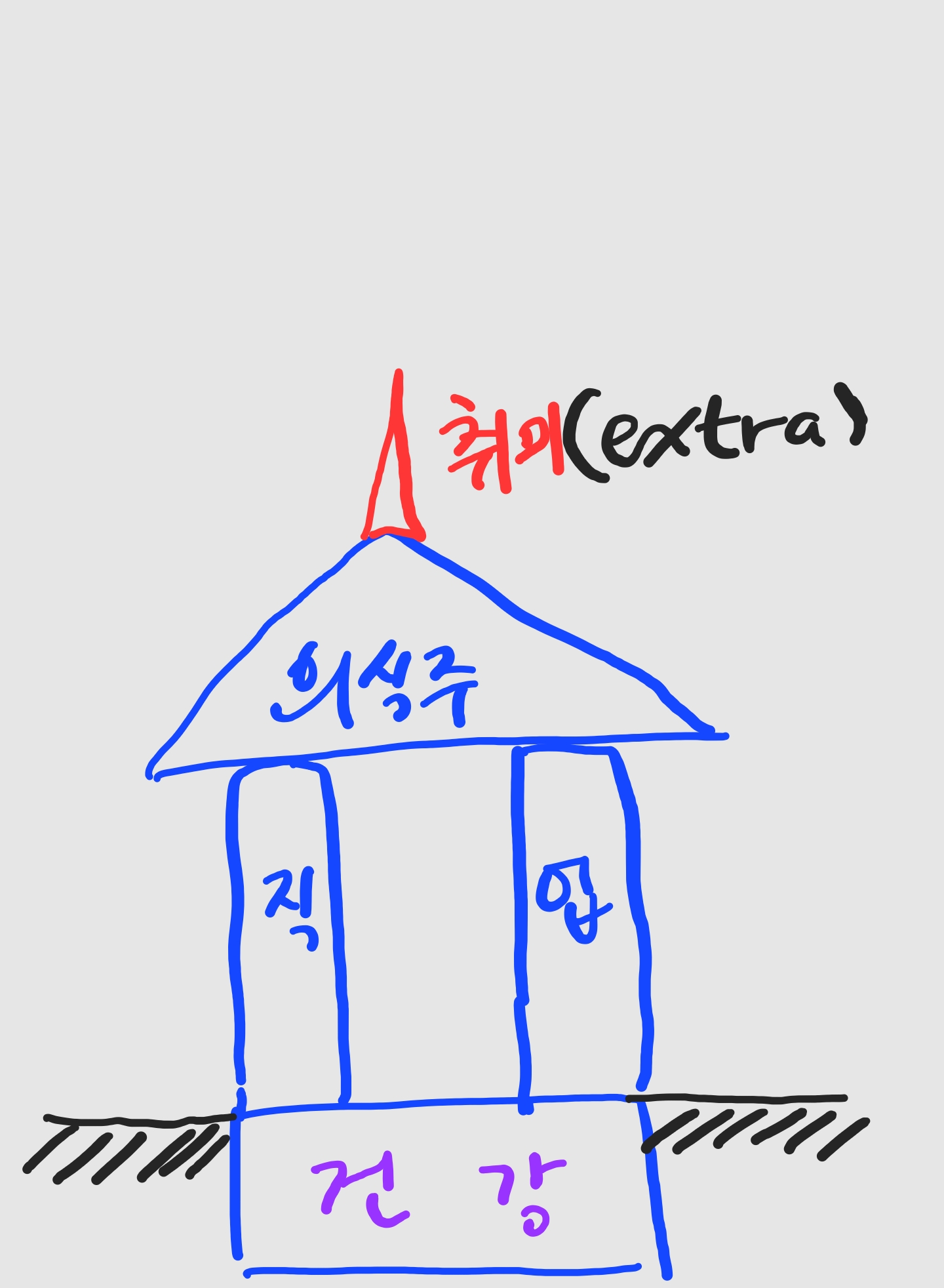 그 위에 직업이라는 기둥을 세운다. 이걸 안 세우면 어떻게 되냐? 그러면 지붕을 내가 받쳐야 한다. 지붕받치다가 인생이 끝나버린다. 1915년에 태어난 우리 할배처럼 특별하게 명시된 직업없이 의식주 해결을 위해 온갖 일을 다 하며 일생을 보내야 한다. (농사도 짓고 물고기도 잡고 집도 짓고, 물도 길어오고, 구들장도 깔고 담도 만들고, 베틀로 옷도 짜야한다 ) 내가 직업이 없으면 의식주라는 지붕을 지탱하기 위해 내가 의식주와 관련된 고된 일을 내가 직접 다 해야한다. 내가 직업이 있으면 의식주를 유지하는 노력을 돈으로 사면 된다. 내가 직접 아파트 지을 필요 없이 그냥 돈 주고 집을 사면 된다. 옷도 사고 음식도 사면 된다.