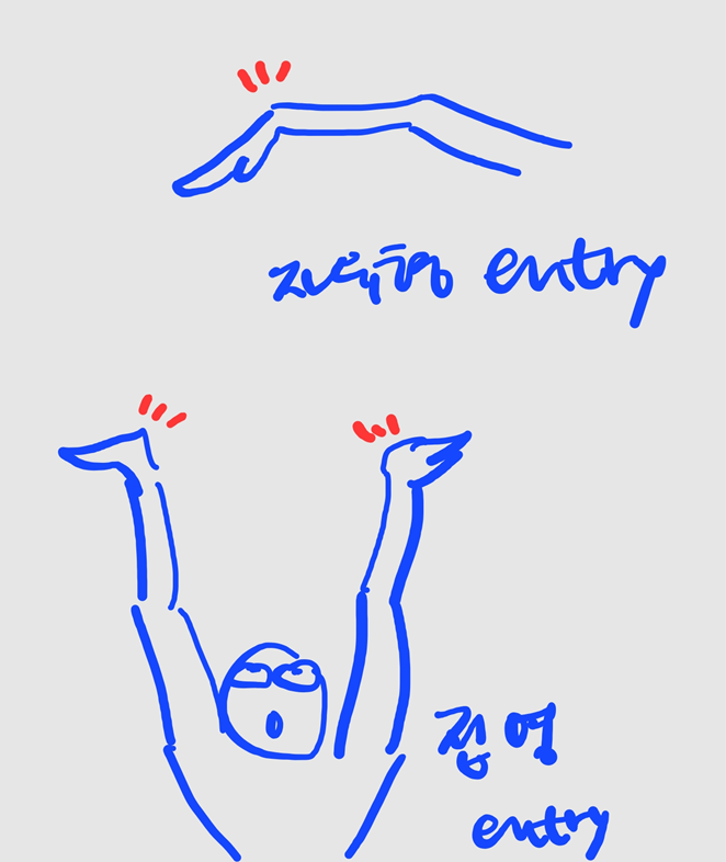 리커버리해서 물을 찌를때는 손가락을 모두 모아서 저항을 최소한으로 해서 찔러 들어가고