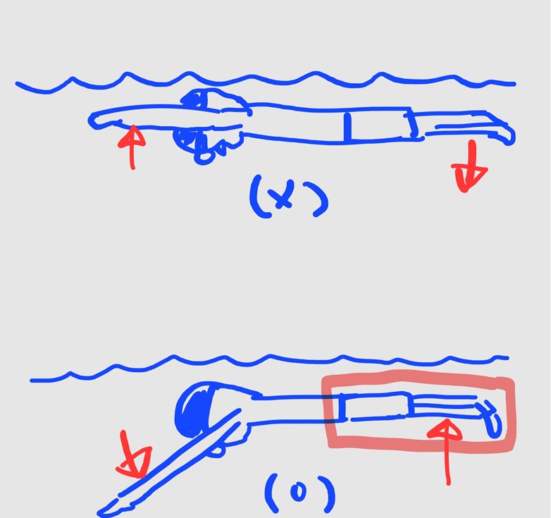 문제는 하체 저항이다. 엉덩이부터 다리가 밑으로 쳐지만 엄청난 저항을 받으면서 나아가야한다. 그래서 위의 빨강색 네모박스 부분을 수면과 일자로 만들어야 한다.