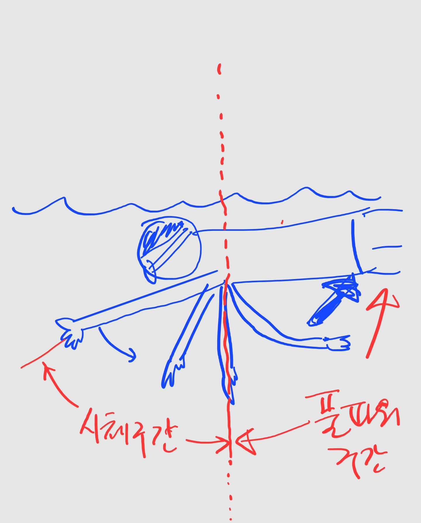 팔이든 상체든 공중에서 수면으로 자유낙하할 때는 전신에 힘을 빼고 시체처럼 물을 타고 스트록할 때만 힘을 빡!! 주고 다시 시체처럼 힘을 빼고 자유낙하의 힘으로 물속으로 툭!! 들어가서 다시 스트록만 힘주고 다시 자유낙하...