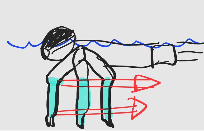 이건 자유형 뿐 아니라 모든 영법에 적용된다. 팔뚝으로 물을 밀어낸다. 어느 방향으로? 내 몸이 나아가고자하는 방향에 정확하게 수직으로 팔뚝을 세워서 밀어낸다.
