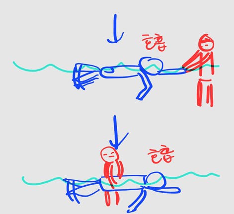 접영은 한팔접영, 자유형은 한팔 스트로크를 가르치는데 팔이 가라앉아버리면 못 배우기 때문에 반드시 한쪽 팔을 강사가 잡아서 앞으로 끌어줘야 한다.